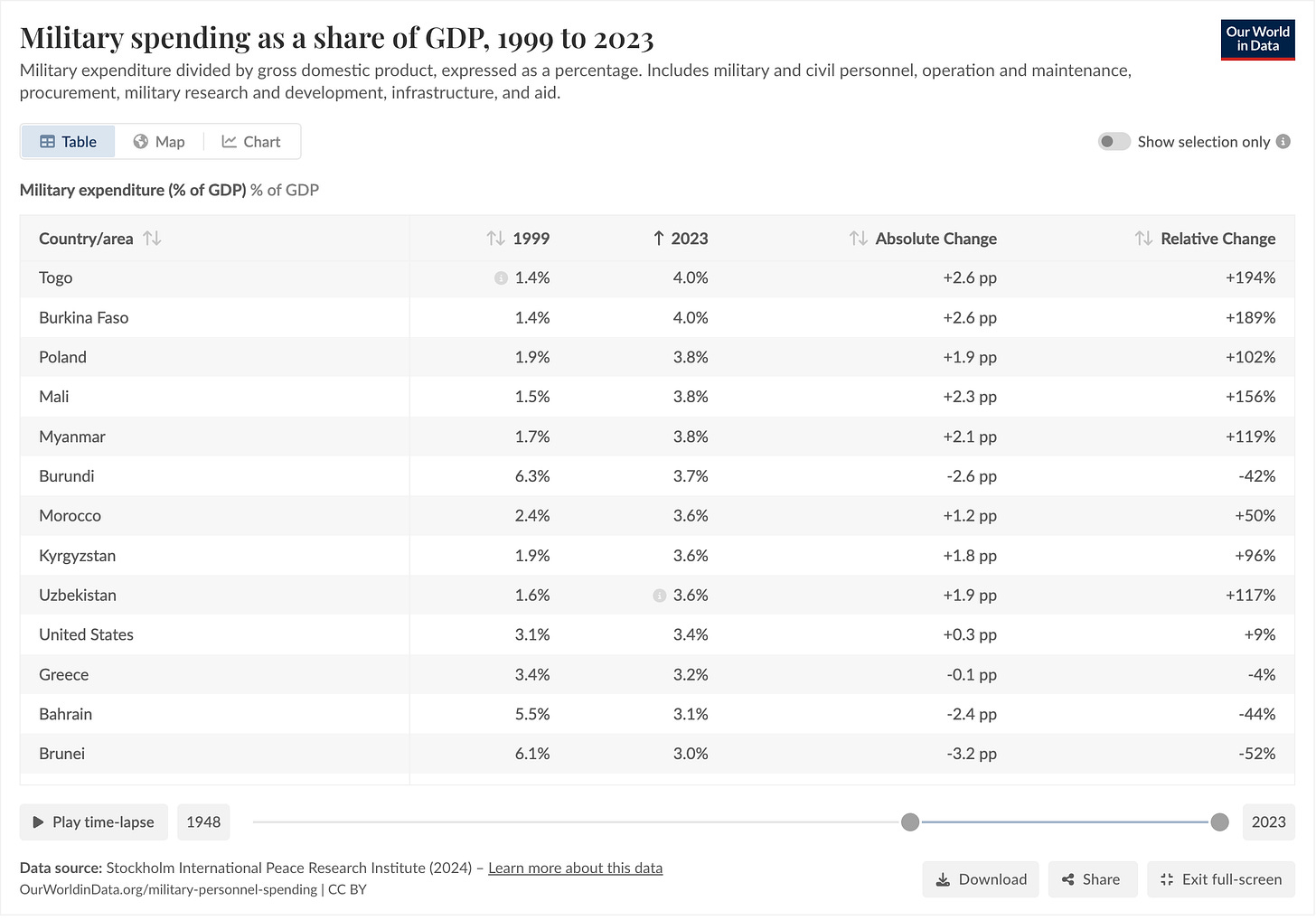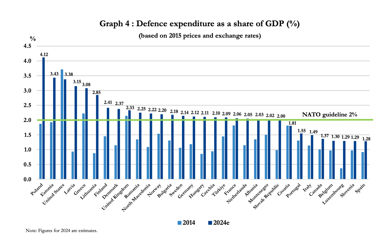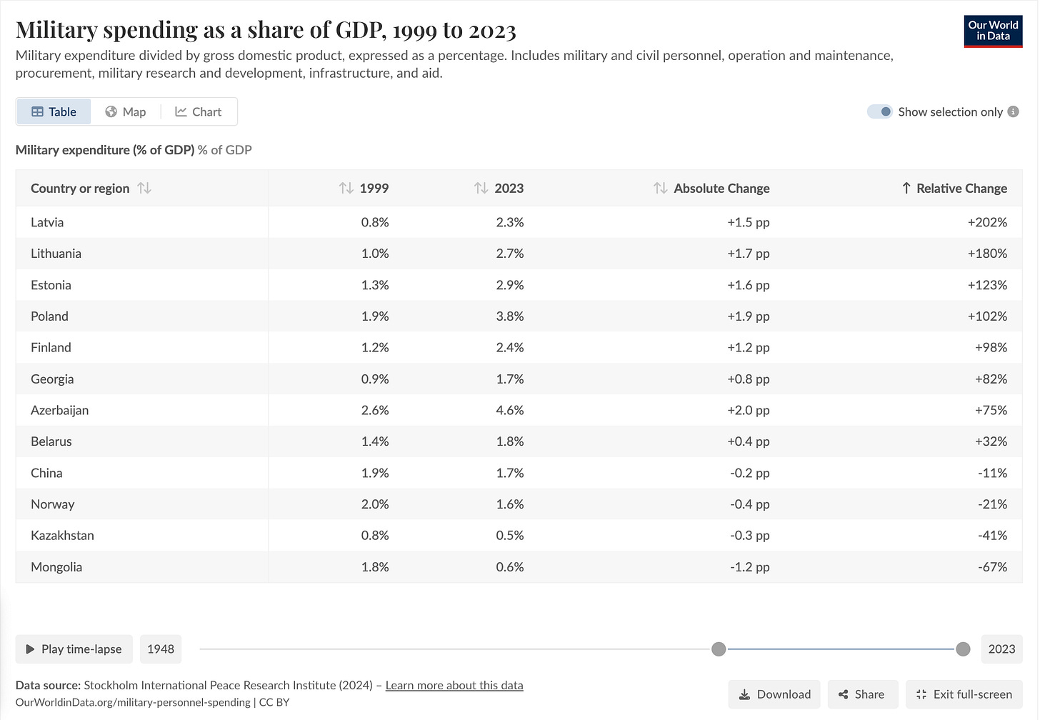 Major observation: Russia’s Asian neighbours have reduced military spending as a percentage of GDP between 1999 and 2023 while its European neighbours have ramped up spending the most.