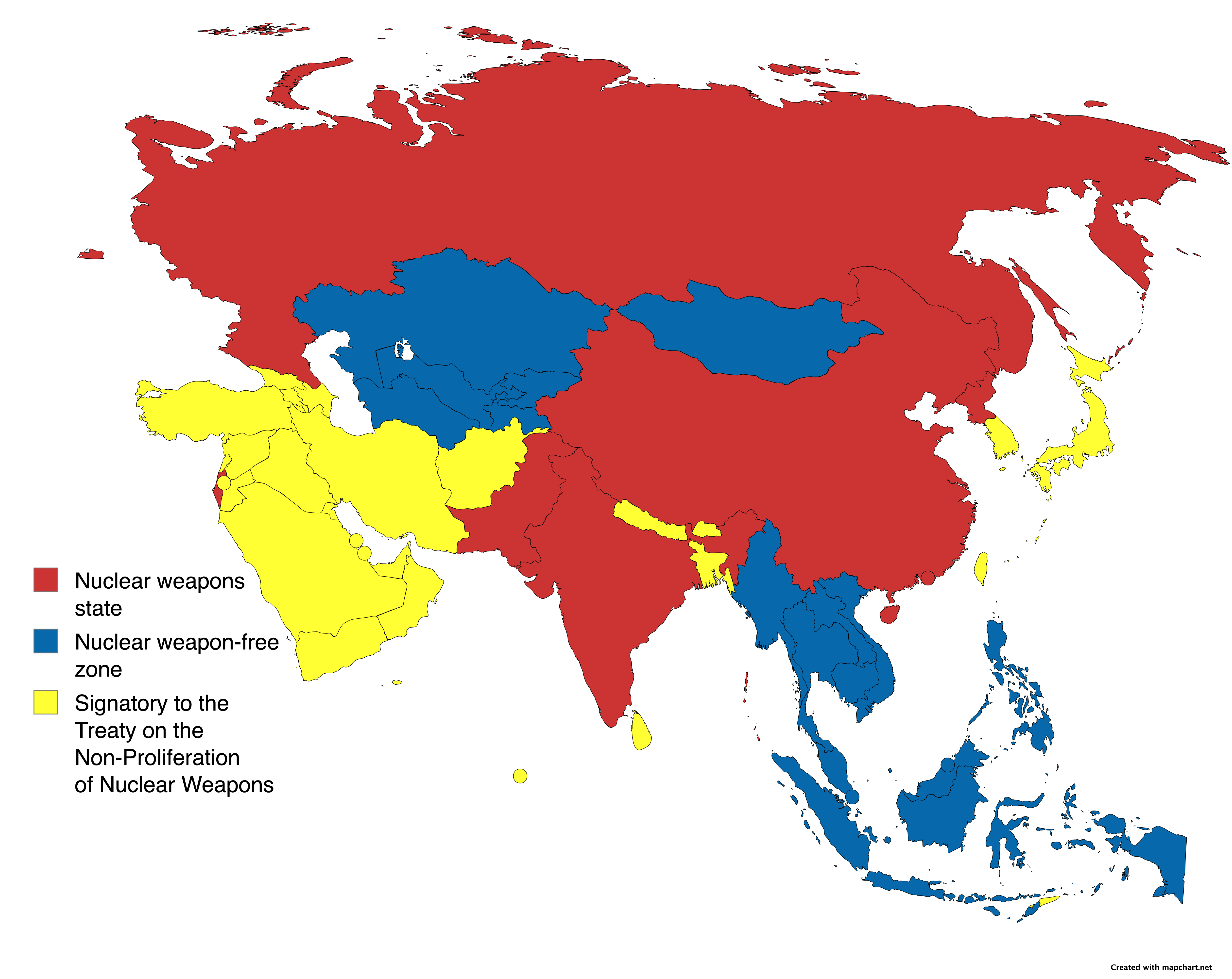 Furthermore, Mongolia and Kazakhstan (along with all former Soviet republics in Central Asia) have declared themselves part of a nuclear weapon-free zone despite being surrounded by nuclear-armed states.