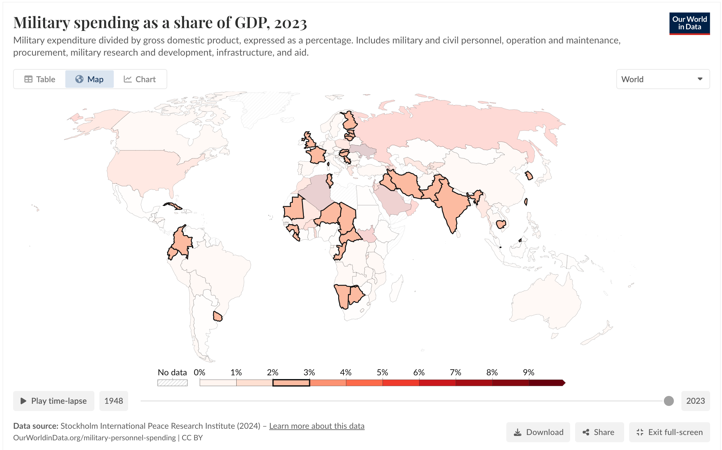 Many countries that spend between 2% and 3% on their militaries are located in conflict-affected areas that are poverty-stricken or in Eastern Europe (plus the United Kingdom and France).